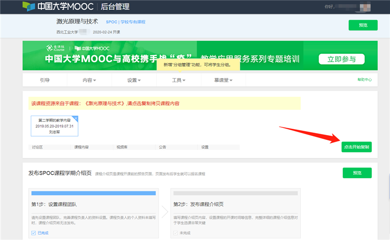 第六步:進入發布內容頁面,按照引導操作,務必首先“點擊開始復制”課程資源。復制完畢,老師們就可以對源課程的資源按照自己的教學設計進行修改了。