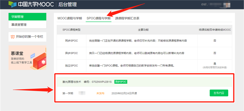第四步:點擊頁面上方“SPOC課程與學期”,在下方即可查看到相應課程,也就是我校管理員已經為對應老師建好的SPOC。