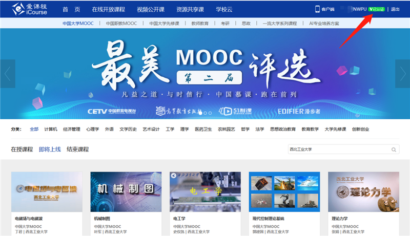 第一步:老師需確認自己的賬號是否通過教師認證,如認證成功,頁面右上方則會顯示已認證。如果老師們沒有完成認證,學校的管理員就沒辦法在平臺上找到您,也就無法為您建SPOC。