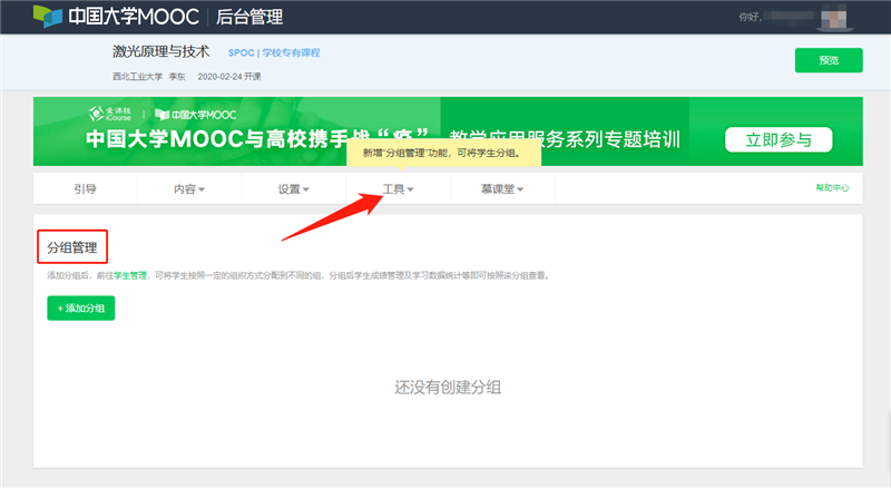 2.分組管理:進入“工具-分組管理”可對學生進行分組,便于管理學生的學習數據和成績管理。當然,也可以將每個組視作一個班,這就是我們通常說的如果同一門課有多個課頭有多個老師上課,而老師們協商可以放在一個SPOC里,多個老師作為課程團隊成員分工管理。當然,也可以每個課頭建一個SPOC,高校管理員就是根據不同課程組的老師們的需求為大家建對應數量的SPOC。需要注意的是,同一門課程無論多少個課頭,請務必采用同樣的考核模式。