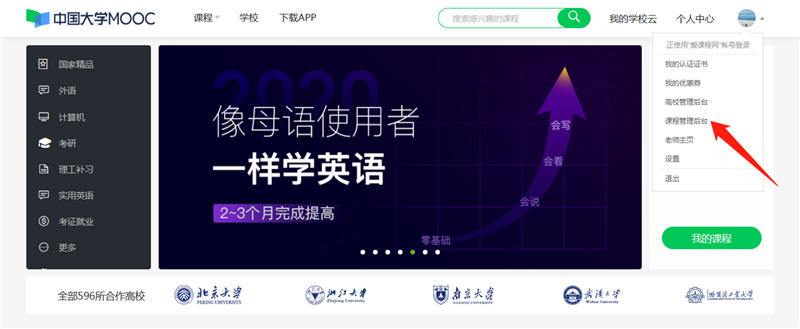 第三步:鼠標停放在頁面右上方頭像處,在彈出菜單欄點擊“課程管理后臺”進入。