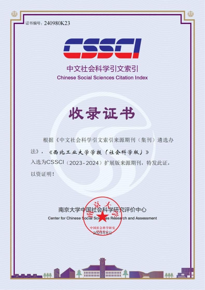 西工大新聞網9月8日電(孫偉民,楊丹)近日,南京大學中國社會科學研究評價中心中文社會科學引文索引(CSSCI)來函,《西北工業大學學報(社會科學版)》(以下簡稱“學報”),首次入選CSSCI(2023—2024)擴展版來源期刊。學報于1999年創刊,2018年進行了全面系統化改版升級建設,首次取得了具有里程碑意義的重大歷史性突破,為學校推進“雙一流”建設和繁榮哲學社會科學提供了重要平臺。