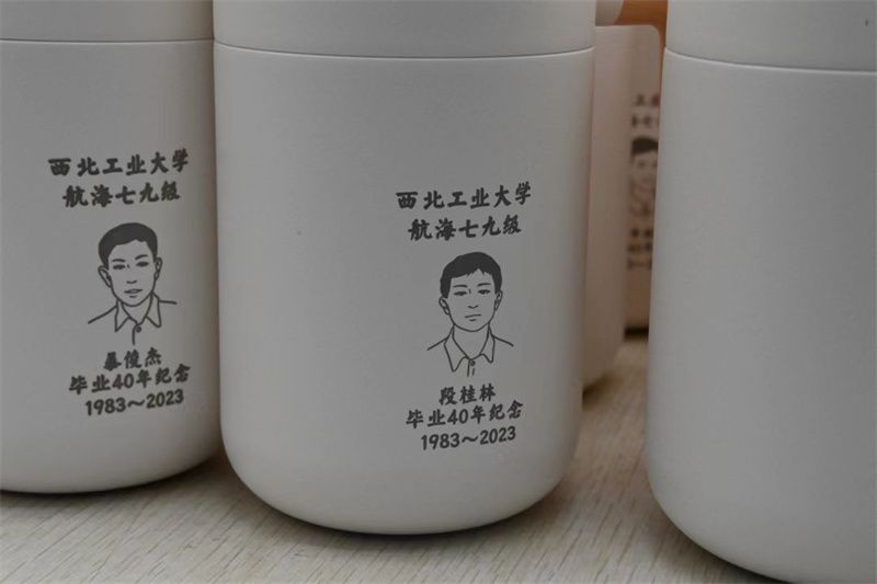 航海學院1979級校友畢業四十周年,學院為每一位同學定制了專屬紀念水杯,每一個杯子上都刻畫著他們學生時期的樣子。