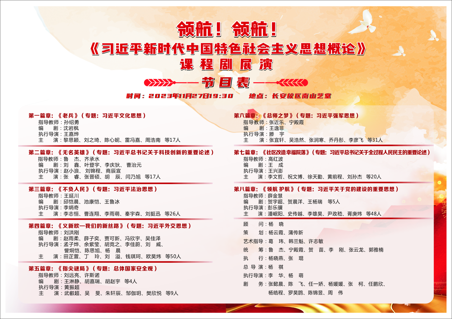 11月27日晚,第二屆“領(lǐng)航!領(lǐng)航!《習(xí)近平新時代中國特色社會主義思想概論》”(以下簡稱《概論》課程劇)展演在長安校區(qū)南山藝堂舉行。本屆展演由我校黨委宣傳部、黨委學(xué)生工作部、教務(wù)處、教育基金會、馬克思主義學(xué)院主辦,校工會、離退休黨委、藝術(shù)教育中心協(xié)辦。