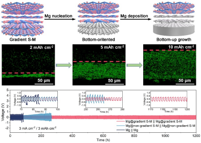 三梯度結(jié)構(gòu)設(shè)計的優(yōu)點在于:底層的高電導(dǎo)率、親鎂性和小孔徑特征可以均勻鎂離子通量,誘導(dǎo)鎂金屬優(yōu)先形核/沉積;頂層的絕緣性、疏鎂性和大孔徑特征可以促進(jìn)鎂離子快速傳輸,抑制“頂部生長”;中間過渡層則可以避免因頂層與底層梯度差異過大而造成的金屬分層。以上特性所誘導(dǎo)的自下而上沉積行為顯著提升了梯度主體材料的鎂沉積/剝離可逆性。