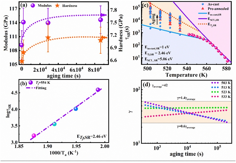 圖2(a)楊氏模量和硬度隨老化時間的演變。(b)應力松弛時間與老化溫度在=554 K的演變規律。(c)在玻璃和過冷液體區域老化過程中的演變。(d)不同老化時間和溫度下參數隨老化時間的演變規律。