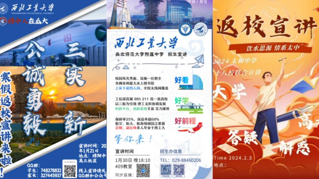 制作各具特色的宣傳海報,抓住高中學子眼球,讓海報做宣傳的“排頭兵”。“線上+線下”同步發力,打破時空限制,利用直播宣講讓西工大聲音傳播到千家萬戶,與高中生們分享招生政策、校園生活、學習經驗,與廣大考生及家長面對面交流、答疑解惑,做西工大在全國各地的“代言人”。