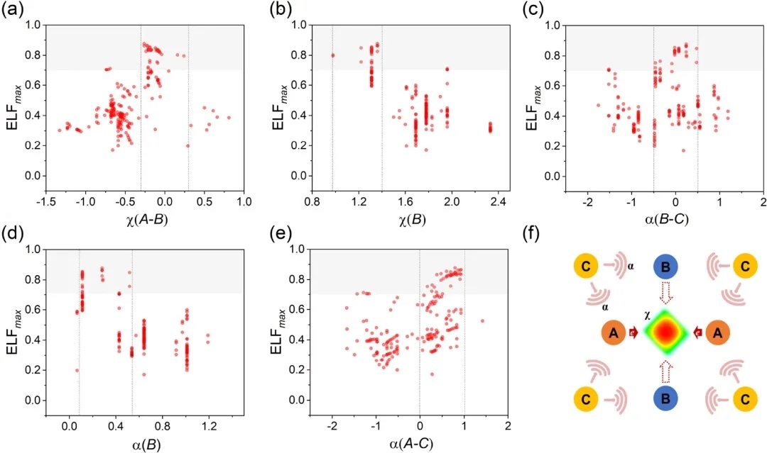 圖4. 間隙電子形成分析:(a)χ(A – B);(b)χ(B);(c)α(B – C);(d)α(B);(e)α(A – C);(f)間隙電子形成的示意圖