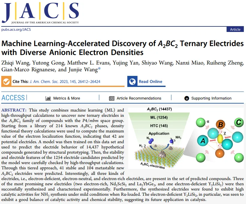 數據庫外巨大的潛在化學空間為電子化合物尋找提供了更多的可能。但是巨大的篩選空間也對研究方法提出了挑戰。因此,開發高效尋找新型電子化合物的研究方法成為當務之急。近期,西北工業大學王俊杰教授與比利時魯汶天主教大學Gian-Marco Rignanese教授合作,首次將機器學習方法引入電子化合物的搜索研究,從包含14437個候選化合物的化學空間中篩選出了145種具有不同局域電荷密度的新型A2BC2電子化合物,并合成了三種代表性材料(“富電子”型電子化合物:Nd2ScSi2和La2YbGe2,“缺電子”型電子化合物:Y2LiSi2)。實驗證實,通過間隙電荷濃度的調控,“缺電子型”電子化合物Y2LiSi2被用作合成氨催化劑載體時,兼具優異的耐氧化穩定性和催化活性,這為未來電子化合物在催化材料領域的應用提供了新的重要研究方向。相關研究成果以Machine Learning-Accelerated Discovery of A2BC2 Ternary Electrides with Diverse Anionic Electron Densities為標題發表在材料領域權威學術期刊Journal of the American Chemical Society上(J. Am. Chem. Soc. 2023, 145, 48, 26412–26424)。