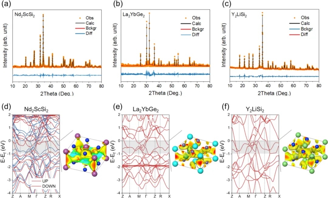 圖5. 預測的A2BC2電子化合物的晶體和電子結構。XRD結果:Nd2ScSi2(a)La2YbGe2(b)Y2LiSi2(c)。計算的電子結構:Nd2ScSi2(d)La2YbGe2(e)Y2LiSi2(f)