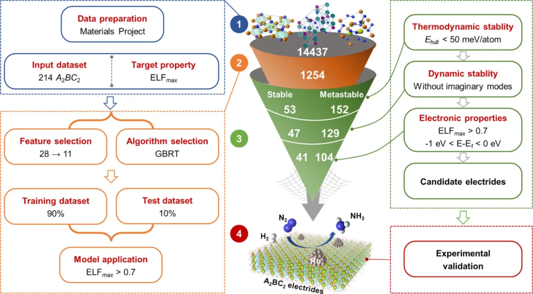 本文首次將機器學習方法引入新型電子化合物的搜索,結合高通量從頭算計算篩選,在結構原型為A2BC2(空間群P4/mbm,編號127)的三元化合物中發現電化物。從近14,500種可能的化合物中篩選出145種(44種穩定和115種亞穩定)具有不同陰離子電子密度的A2BC2新型電子化合物。此外,預測結果通過實驗得到了驗證:兩個富電子型(Nd2ScSi2和La2YbGe2)和一個缺電子型(Y2LiSi2)新型電子化合物被成功合成并作為合成氨催化劑進行了研究。