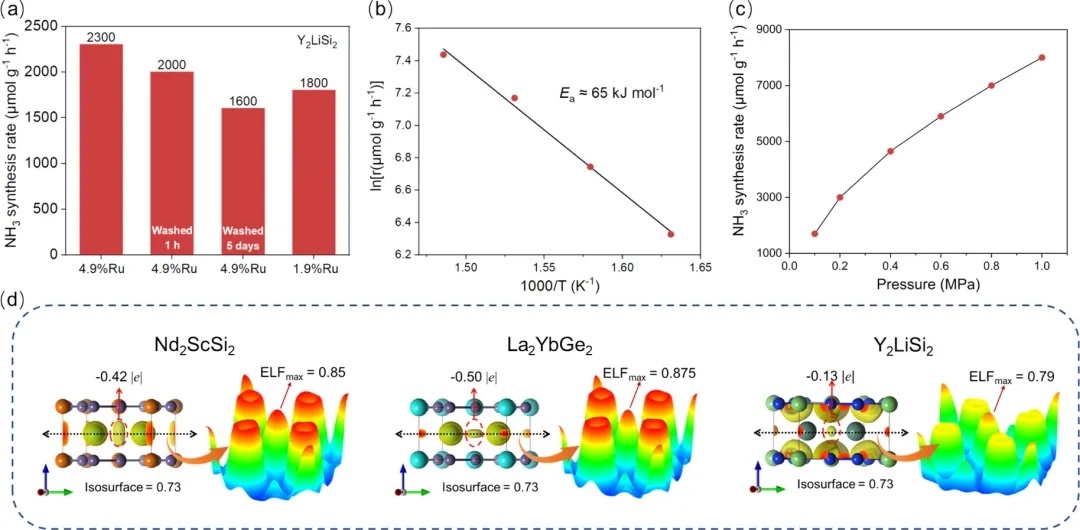 圖8. 缺電子型電子化合物Y2LiSi2的催化合成氨性能和機理:(a)Ru/Y2LiSi2的催化活性;(b)4.9%Ru/Y2LiSi2的表觀活化能測試;(c)不同壓力下4.9%Ru/Y2LiSi2的催化活性;(d)Nd2ScSi2,La2YbGe2和Y2LiSi2的Bader電荷和ELF