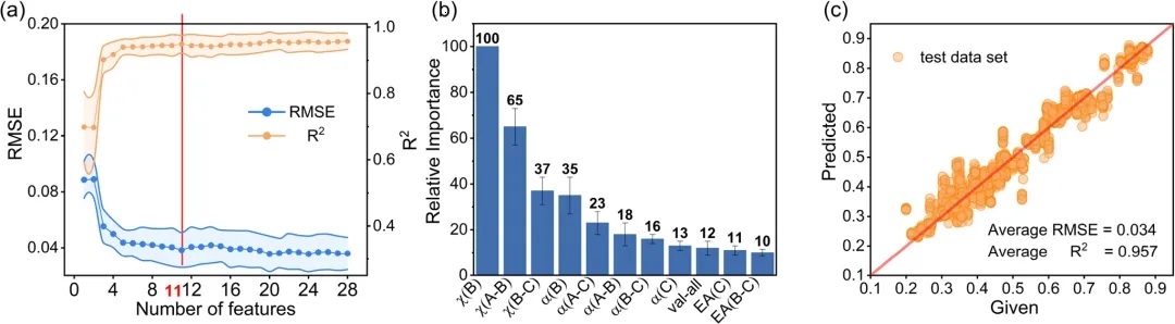 為了限制特征維度,本文使用包裝法進行特征選擇。使用GBRT算法獲得的特征重要性得分來迭代地刪除特征,在每一步中使用剩余的特征訓練ML模型。重復該過程,直至只剩下一個特征。為了在保持高精度的同時降低模型的復雜度,最終使用11個特征進行模型構建。特征重要性分數結果表明了不同特征對目標值的影響程度。在隨機100次測試后,模型在測試數據集上表現優異,RMSE和R2分別為0.034和0.957。