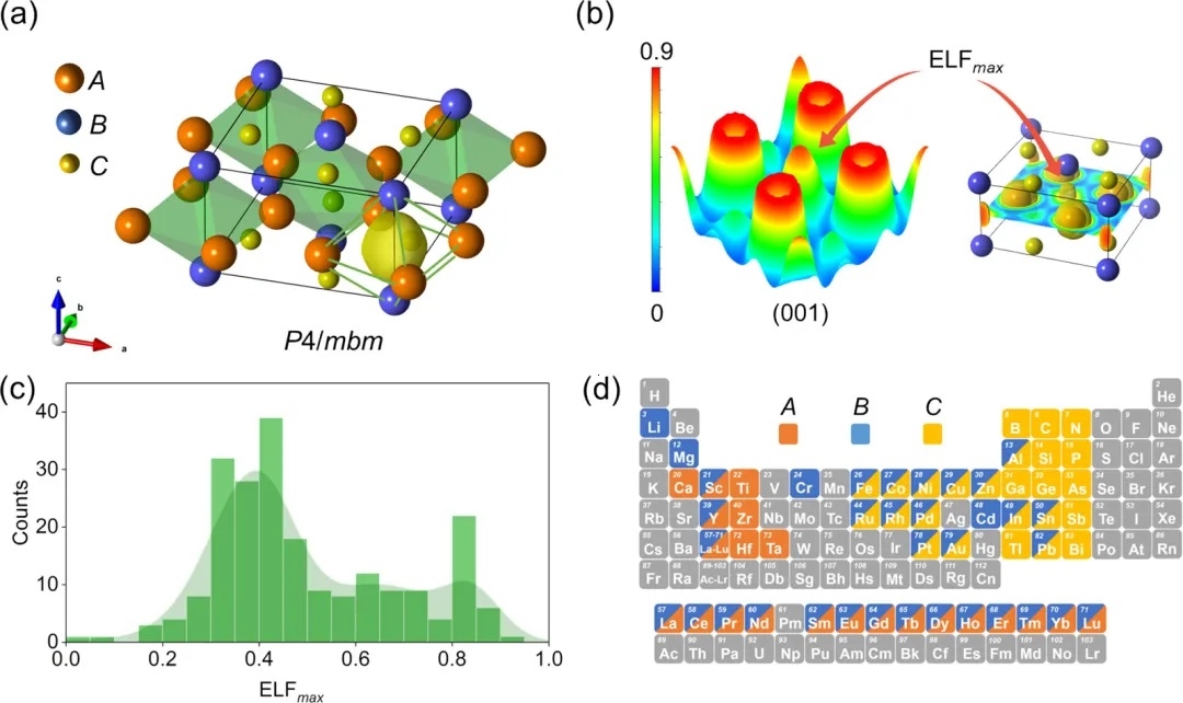 圖2. 數據集構建:(a)A2BC2結構示例(Yb2MgP2)及其ELF;(b)ELFmax示意圖;(c)214種現有A2BC2化合物的ELFmax分布;(d)預測數據集所涉及的元素
