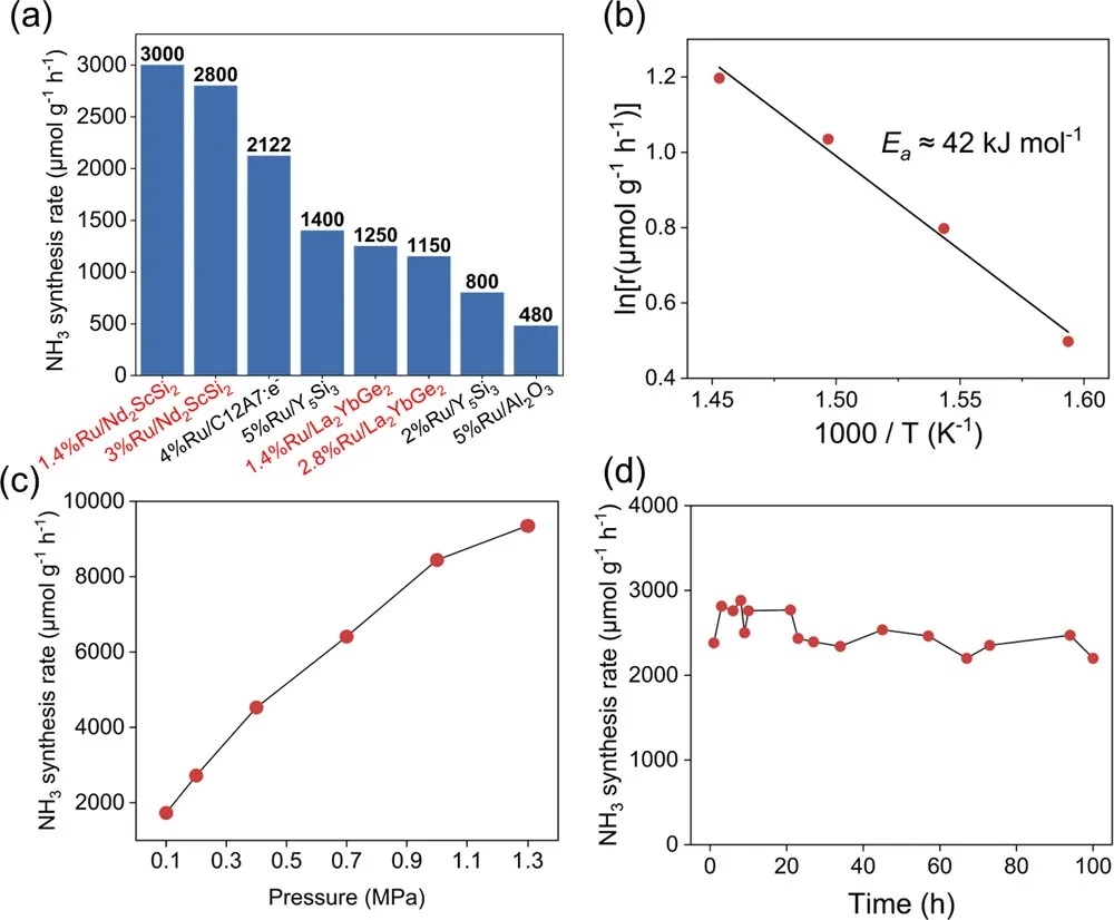 圖7. 富電子型A2BC2電子化合物的合成氨性能評估:(a)在400°C和0.1 MPa條件下催化劑的活性比較;(b)Ru/Nd2ScSi2的表觀活化能測試;(c)3%Ru/Nd2ScSi2在不同壓力下的活性測試;(d)3%Ru/Nd2ScSi2的活性穩定性測試