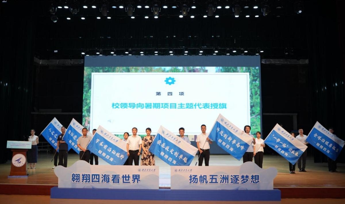 他分別為黨委學(xué)工部、航空學(xué)院、微電子學(xué)院、數(shù)學(xué)與統(tǒng)計學(xué)院、教育實驗學(xué)院、體育部、外國語學(xué)院負(fù)責(zé)人授予2024年“翱翔四海”七大主題旗幟。各部門負(fù)責(zé)同志為暑期項目團隊代表授予項目團旗。