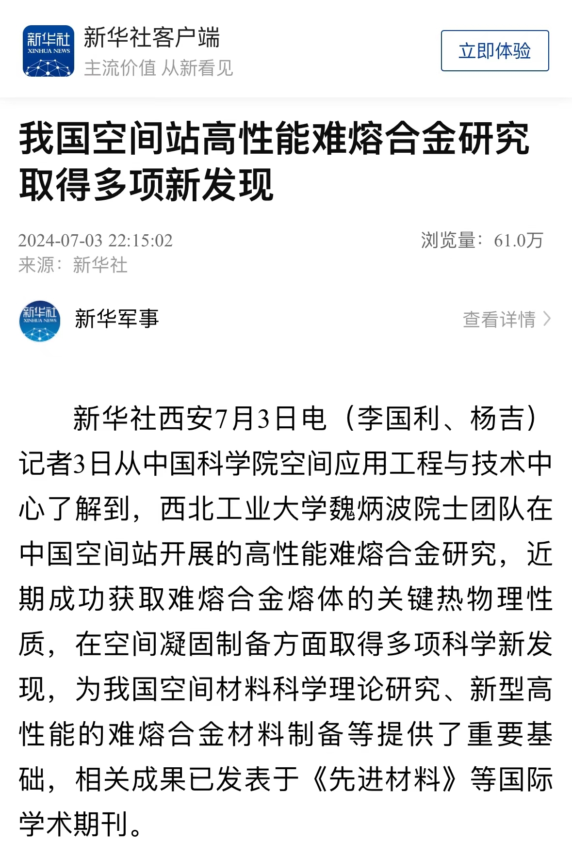 科研團(tuán)隊(duì)利用中國空間站,共對6種合金材料開展了上百次實(shí)驗(yàn),未來還將計(jì)劃對其他材料,尤其是瞄準(zhǔn)國家重大需求的新型功能晶體、特種材料等開展相關(guān)空間研究。
