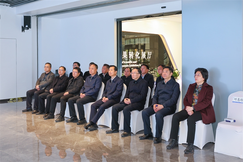 江凌一行參觀了學校科技成果轉化展廳,聽取學??萍汲晒D化相關工作匯報,詳細了解了學校成果轉化企業發展歷程、科技研發及產品應用等情況。